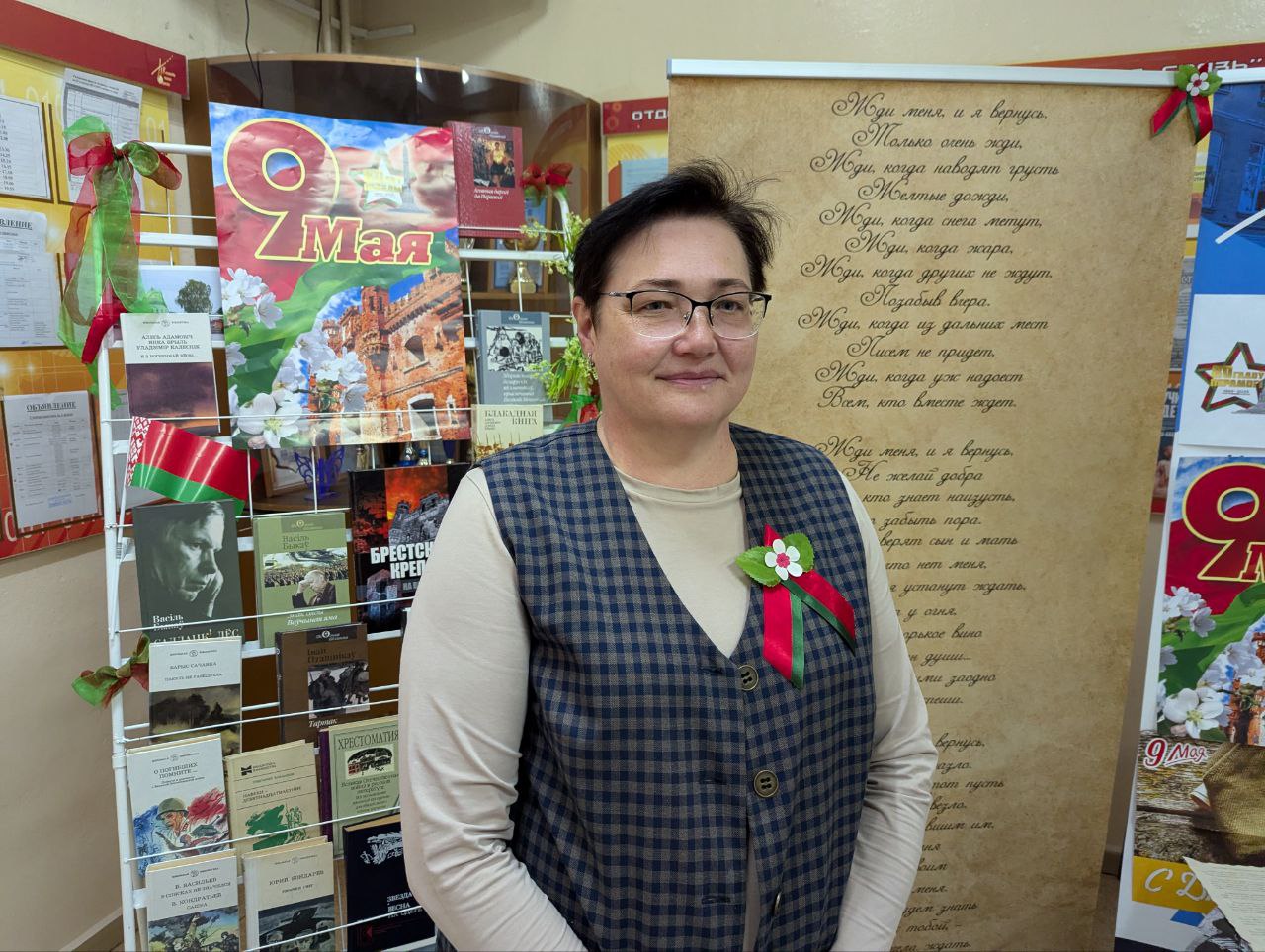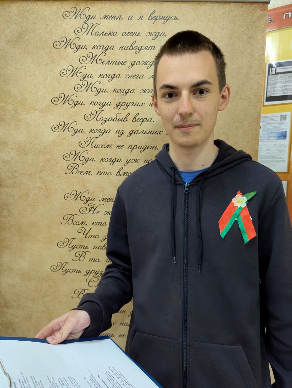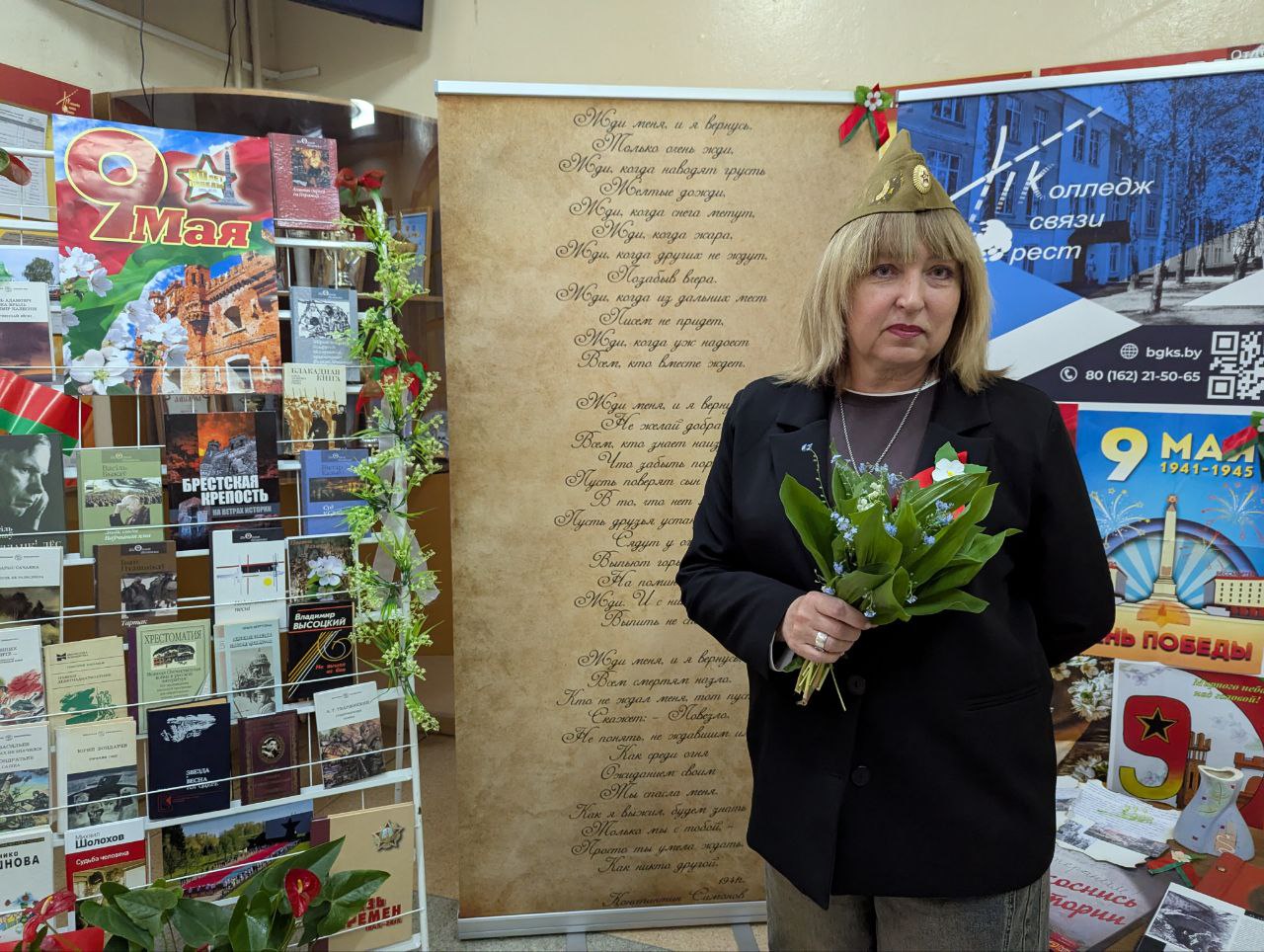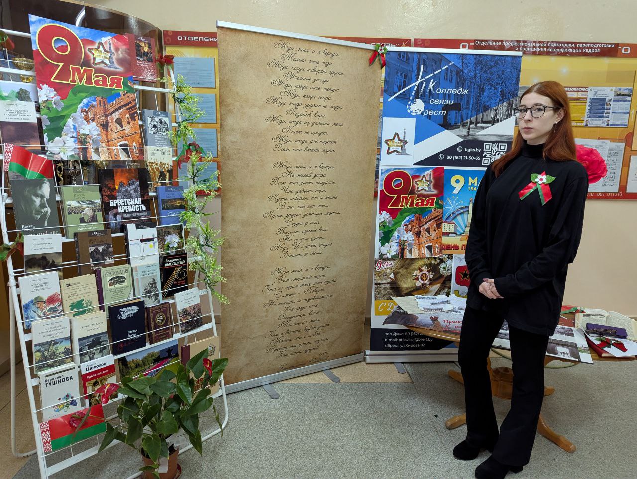08.05.25 в фойе колледжа оформлена фотозона ко Дню Победы. Сотрудники библиотеки организовали выставку литературы писателей и поэтов о войне. Центральное место занимал стенд, на котором можно было прочитать стихотворение Константина Симонова «Жди меня». На экране транслировался виртуальный обзор литературы «Прочитать о войне, чтобы помнить». Рядом находились книги военной тематики об освобождении Бреста и письма-сочинения учащихся «Письмо прадеду». Учащиеся и преподаватели читали стихи белорусских и советских поэтов о войне.