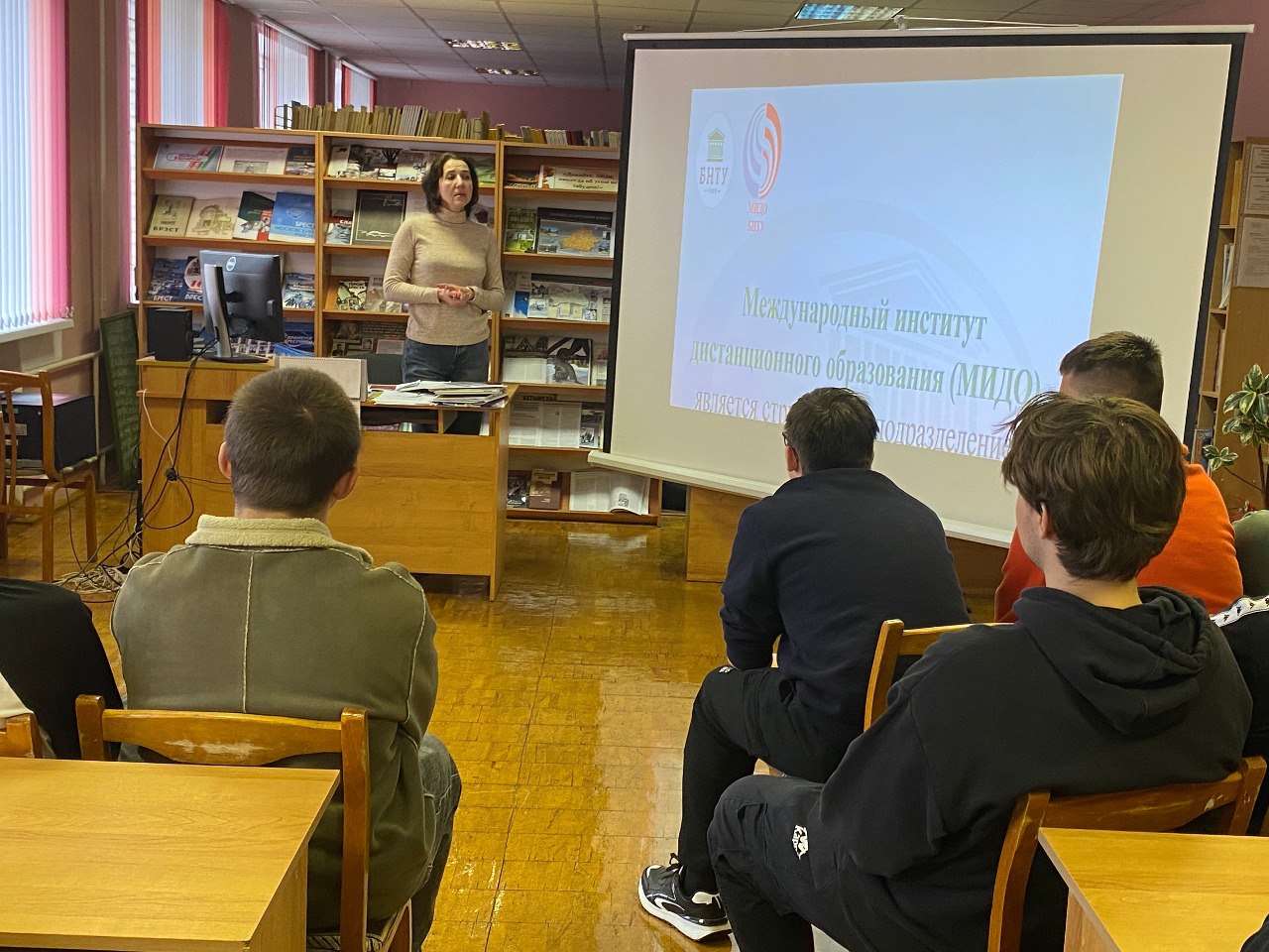 15.10.24 представитель Международного института дистанционного образования старший преподаватель Шапоренко Анна встретилась с учащимися 6 выпускных групп колледжа. Институт является структурным подразделением Белорусского национального технического университета. Обучение в МИДО БНТУ – это возможность получить качественное, признанное в мире высшее образование. Для выпускников колледжей срок обучения 3 года и 10 месяцев. Учащиеся смогут познакомиться с преподавателями и обучением на факультете на мероприятиях «День открытых дверей МИДО», которые будут проходить в онлайн формате.