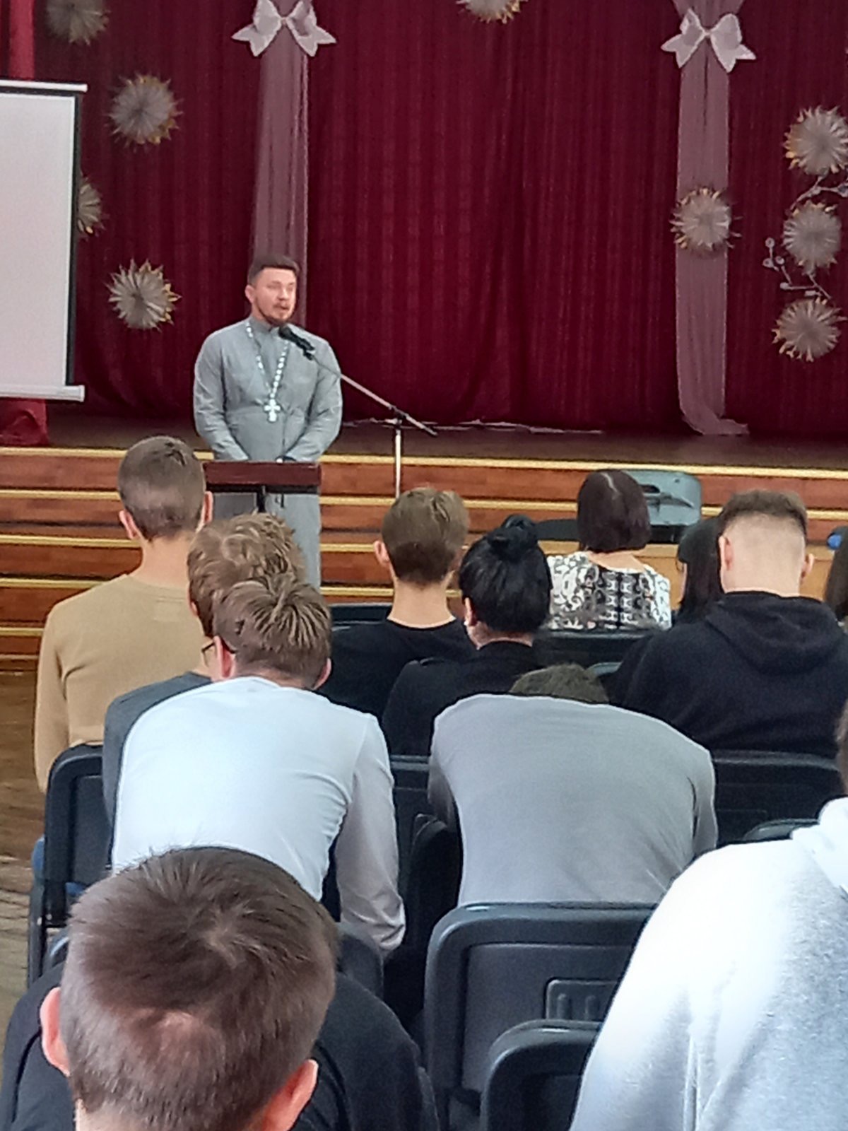 В рамках проведения декады по формированию ценностного отношения к жизни «Моё будущее в моих руках» 28 апреля в актовом зале состоялась встреча учащихся 4-х групп первого курса с представителем Брестской епархии Белорусской Православной Церкви священнослужителем отцом Павлом. Речь шла о человеческих ценностях, мифах и представлениях о смысле жизни, является ли важной наша настоящая жизнь.