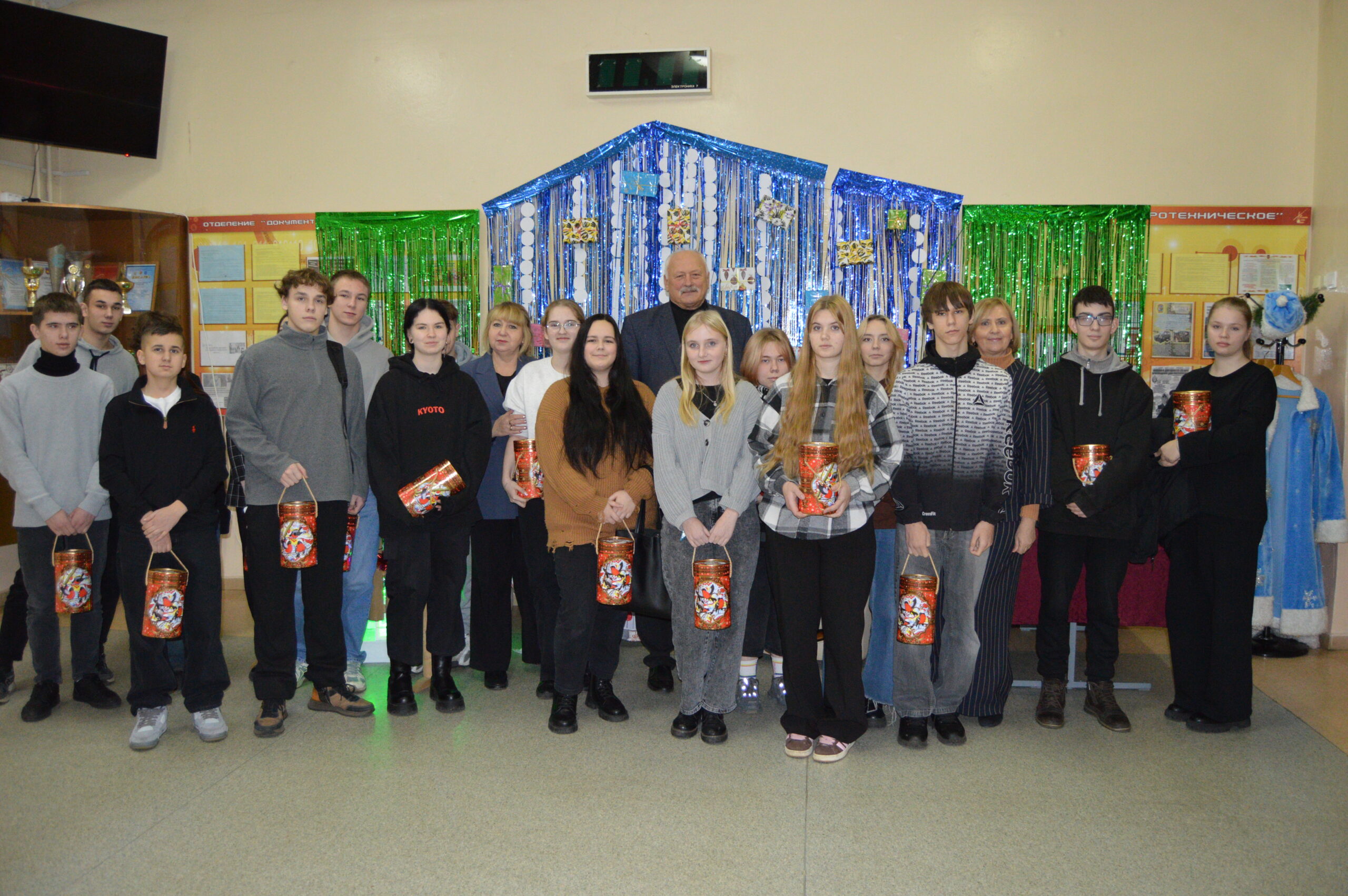 24.12.24 первичная профсоюзная организация учащихся и администрация колледжа организовали поздравление и вручение новогодних подарков детям-сиротам и детям-инвалидам, которые учатся в учебном заведении. Директор колледжа пожелал всем здоровья, успешной сдачи сессии, целеустремленности, исполнения желаний.