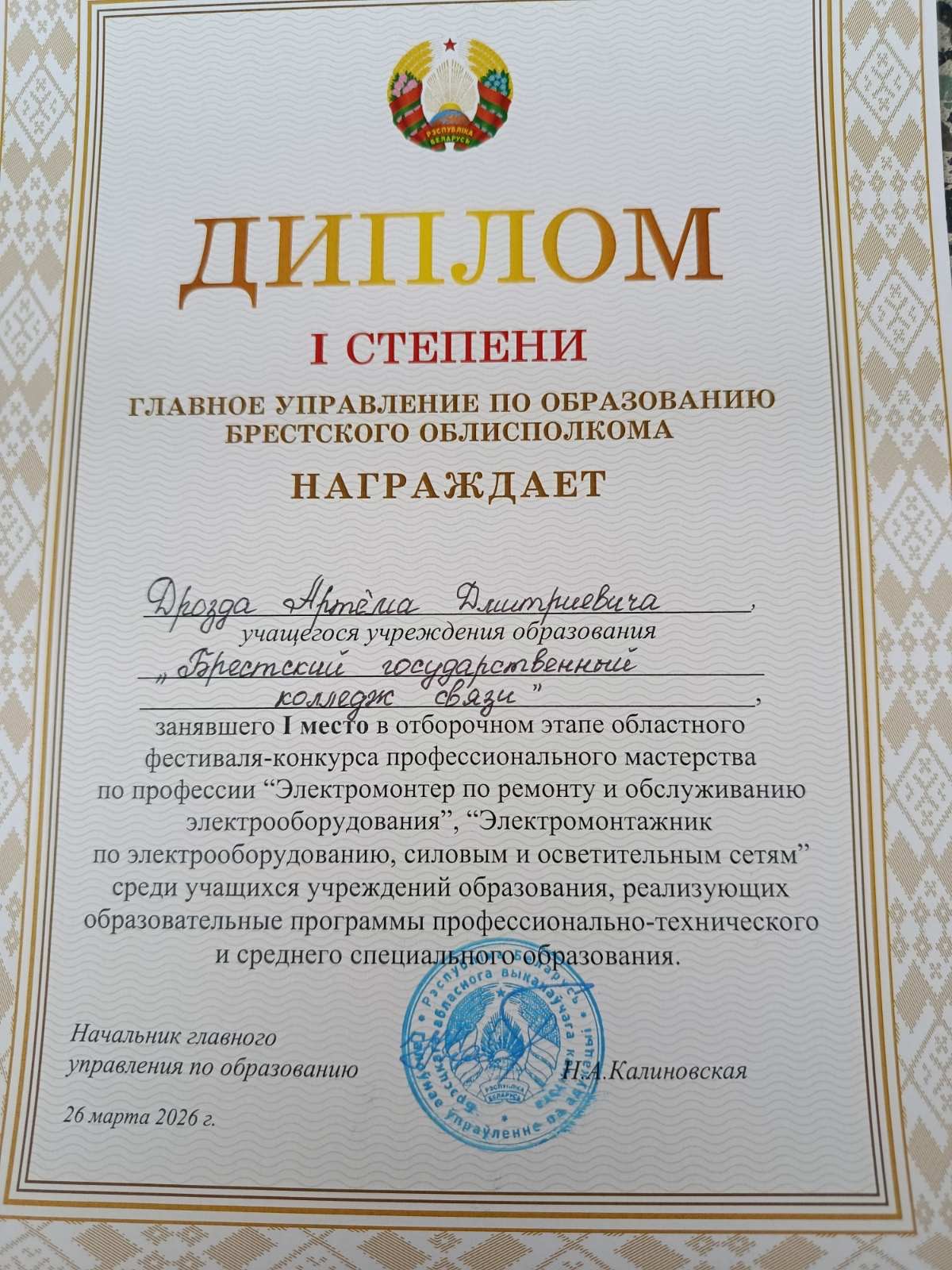 1 место – Дрозд Артем Дмитриевич (Брестский колледж связи);