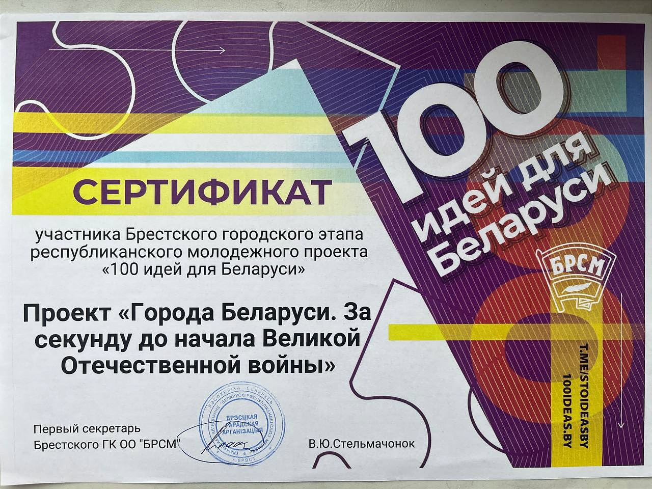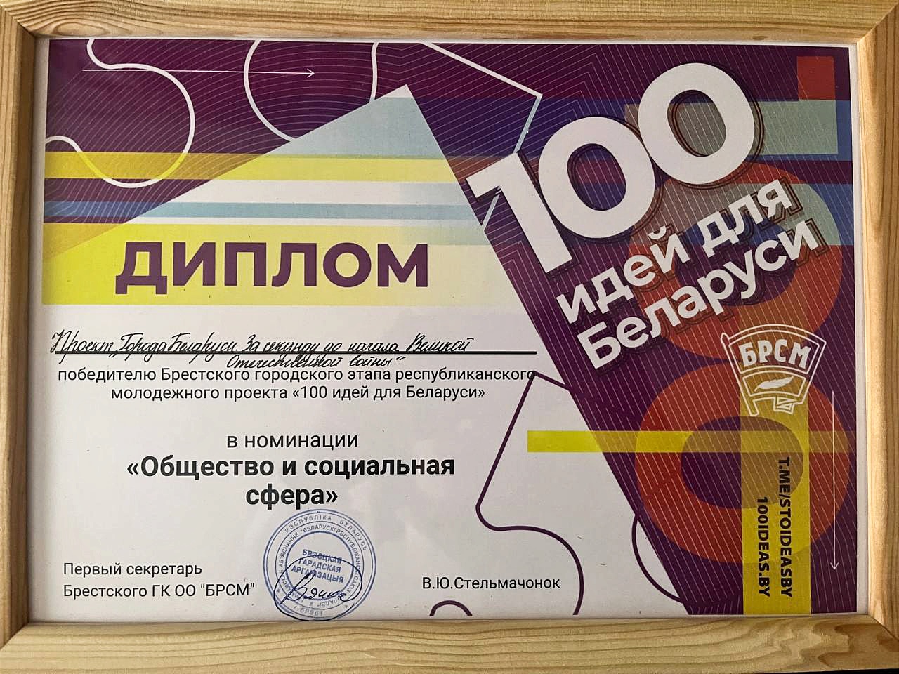 Учащаяся 3 курса Лось Татьяна, группа Д-11, стала победителем Брестского городского этапа республиканского молодежного проекта «100 идей для Беларуси» в номинации «Общество и социальная сфера» проект «Города Беларуси. За секунду до начала Великой Отечественной войны».