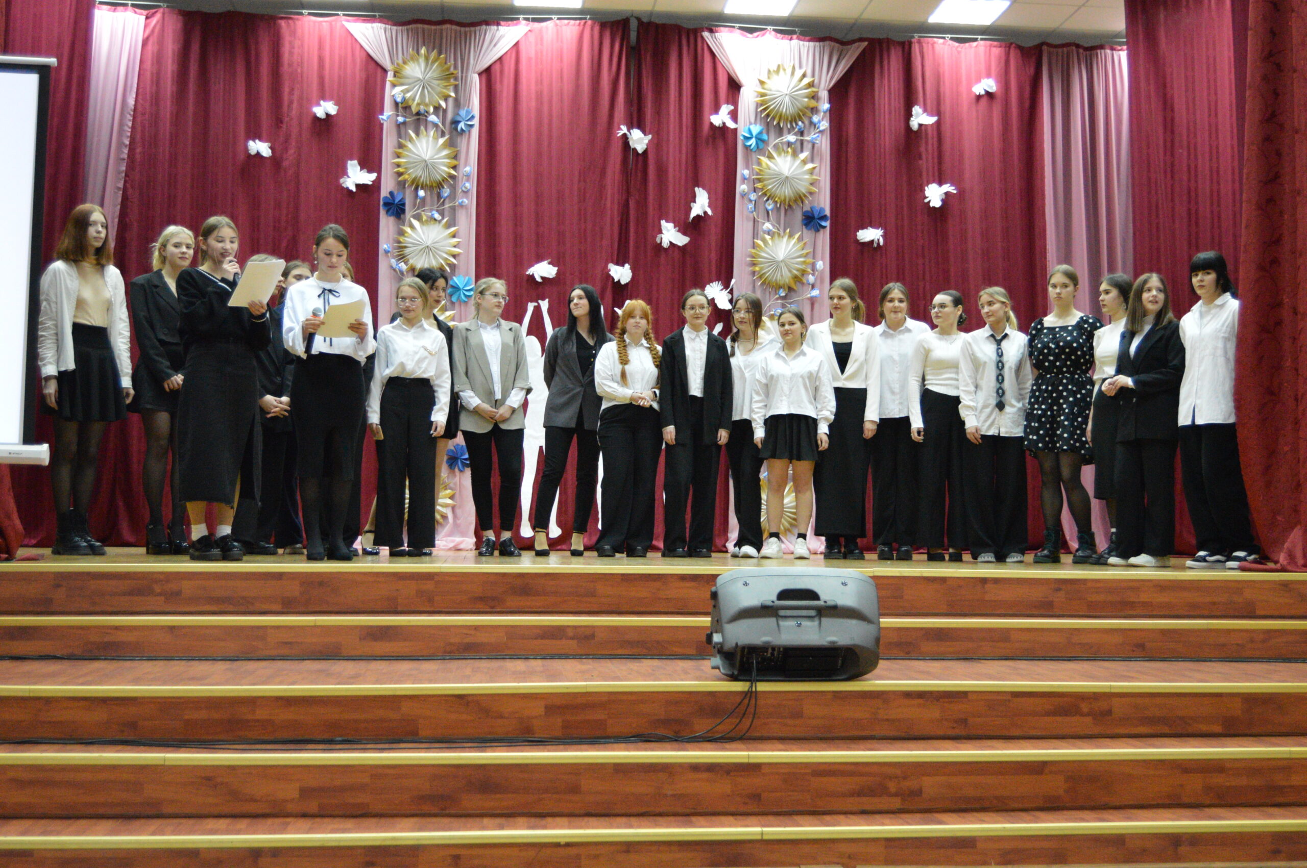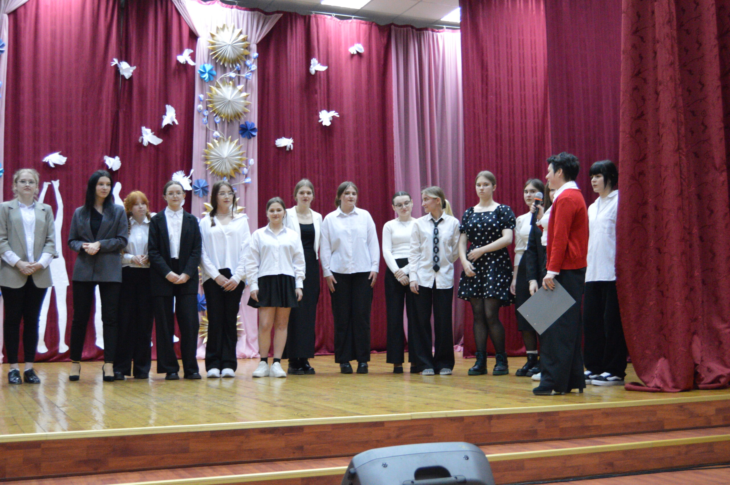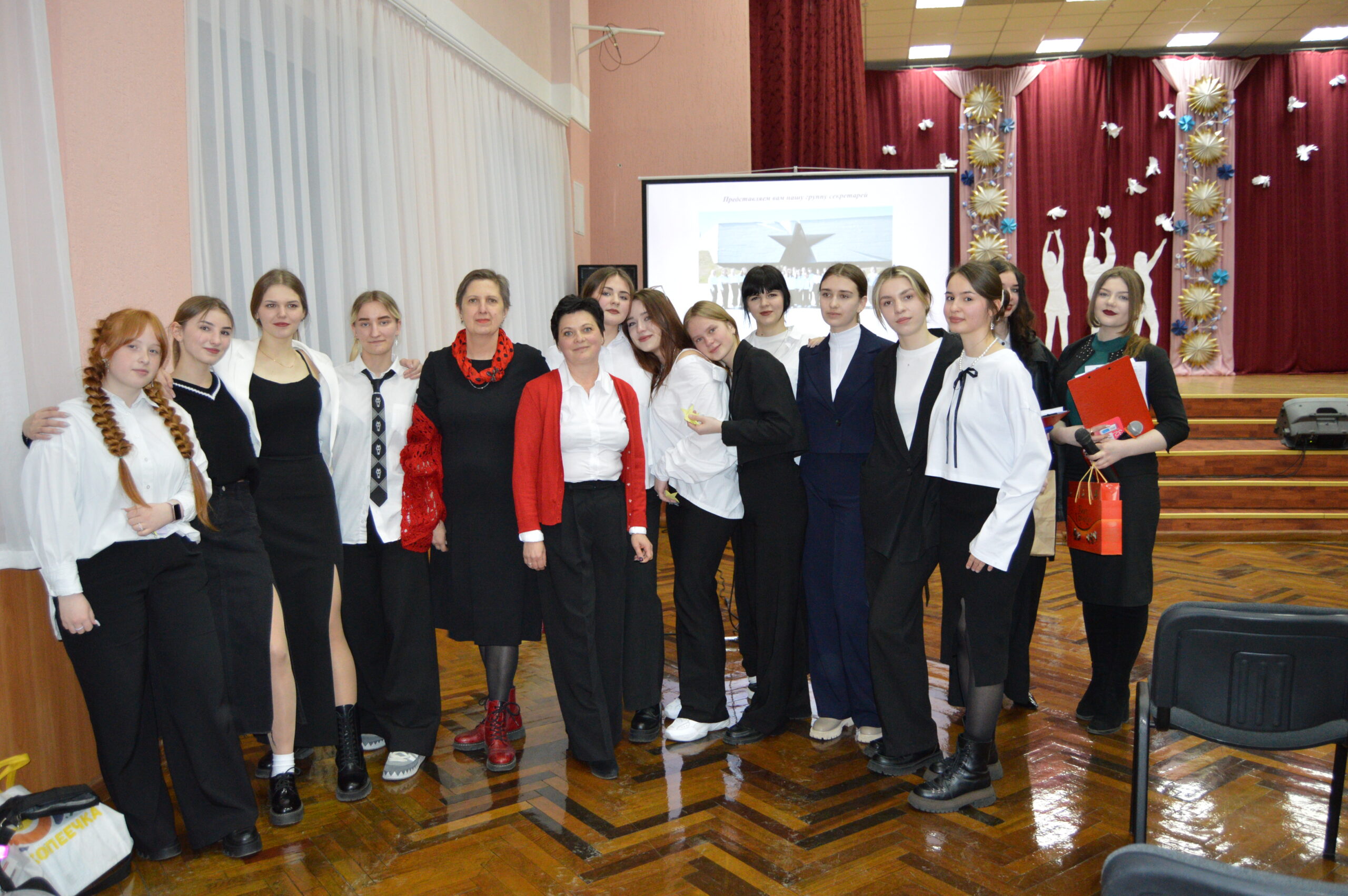 В программе мероприятия было дефиле группы Д-11, в котором учащиеся демонстрировали стильные образы, подходящие для офисной деятельности секретаря.