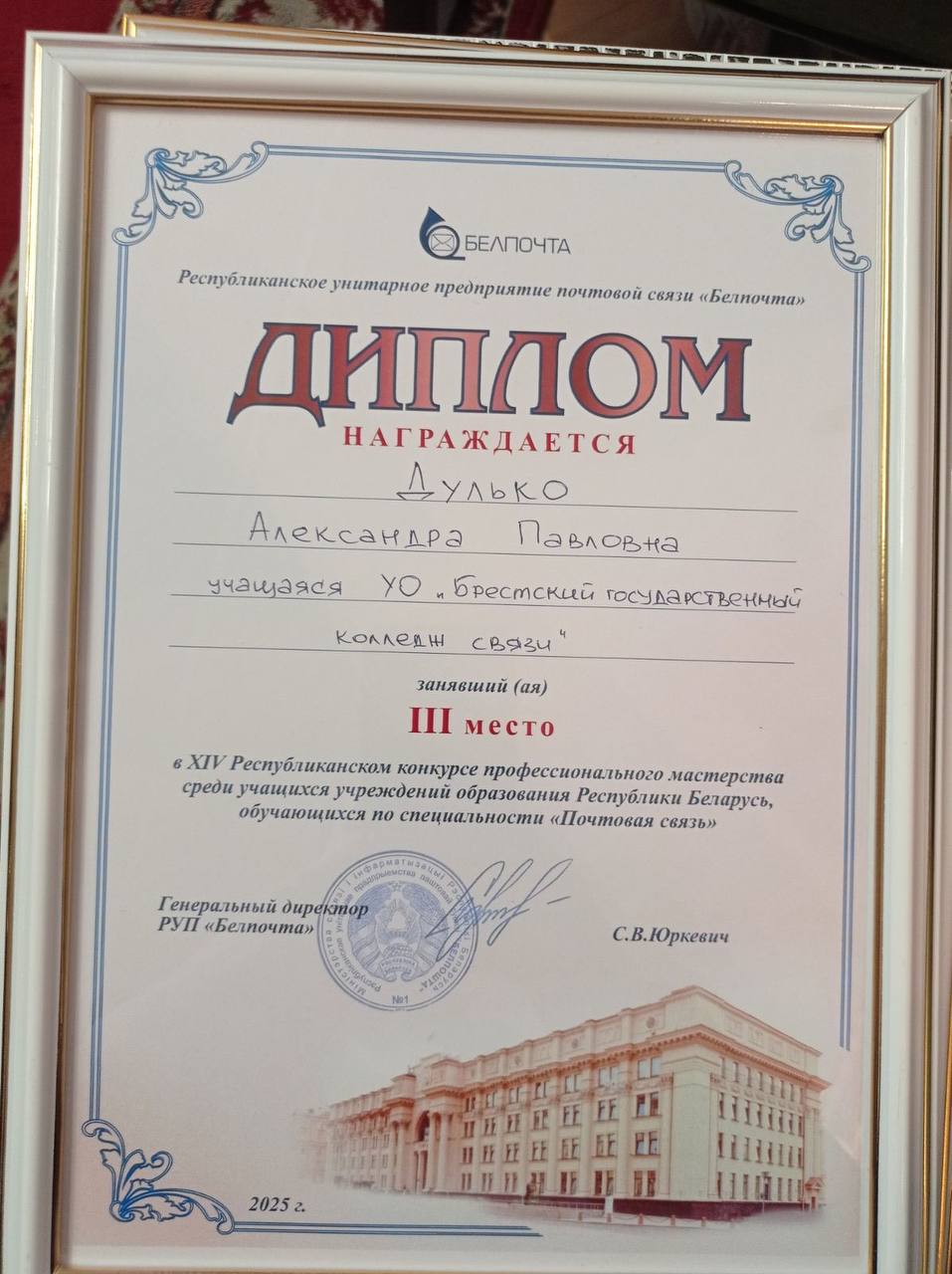 Дулько Александра Павловна заняла 3 место в XIV Республиканском конкурсе профессионального мастерства среди учащихся учреждений образования Республики Беларусь, обучающихся по специальности «Почтовая связь»