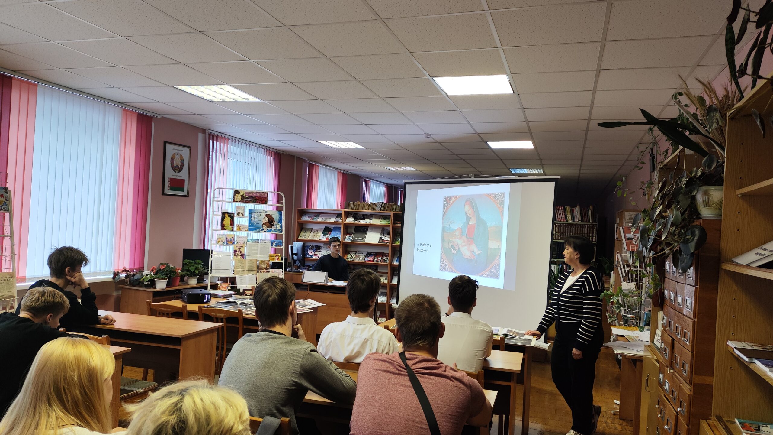 15.10.24 в библиотеке колледжа учащимся, проживающим в общежитии представлена презентация «Самая прекрасная на свете – женщина с ребёнком на руках». Перед учащимися предстали прекрасные образы женщины-матери, созданные иконописцами, художниками эпохи Возрождения и современными мастерами, скульптурные композиции. Ребята читали стихи, отрывки из произведений писателей о матери. В завершение слушали музыкальное произведение немецкого композитора Франца Шуберта «Аве Мария».